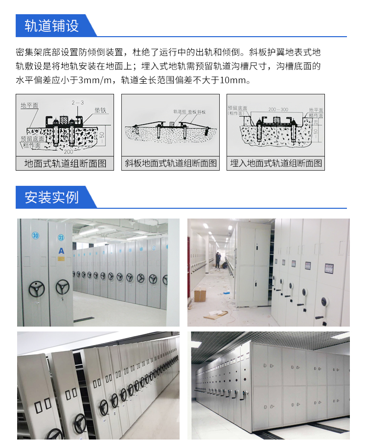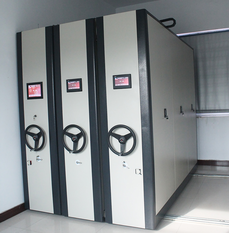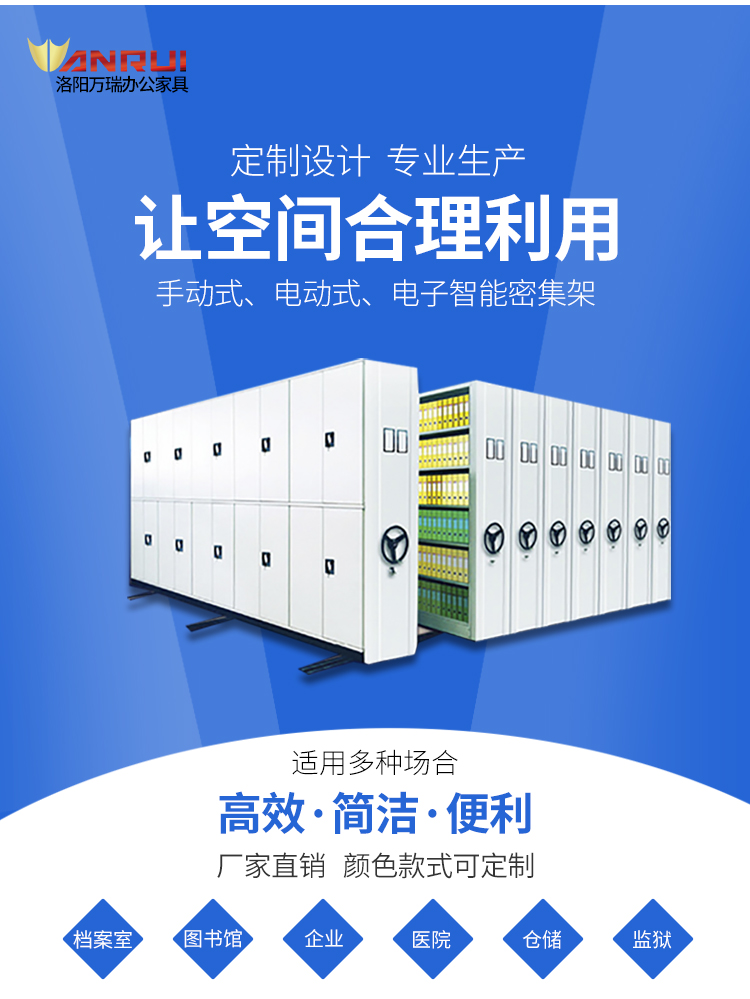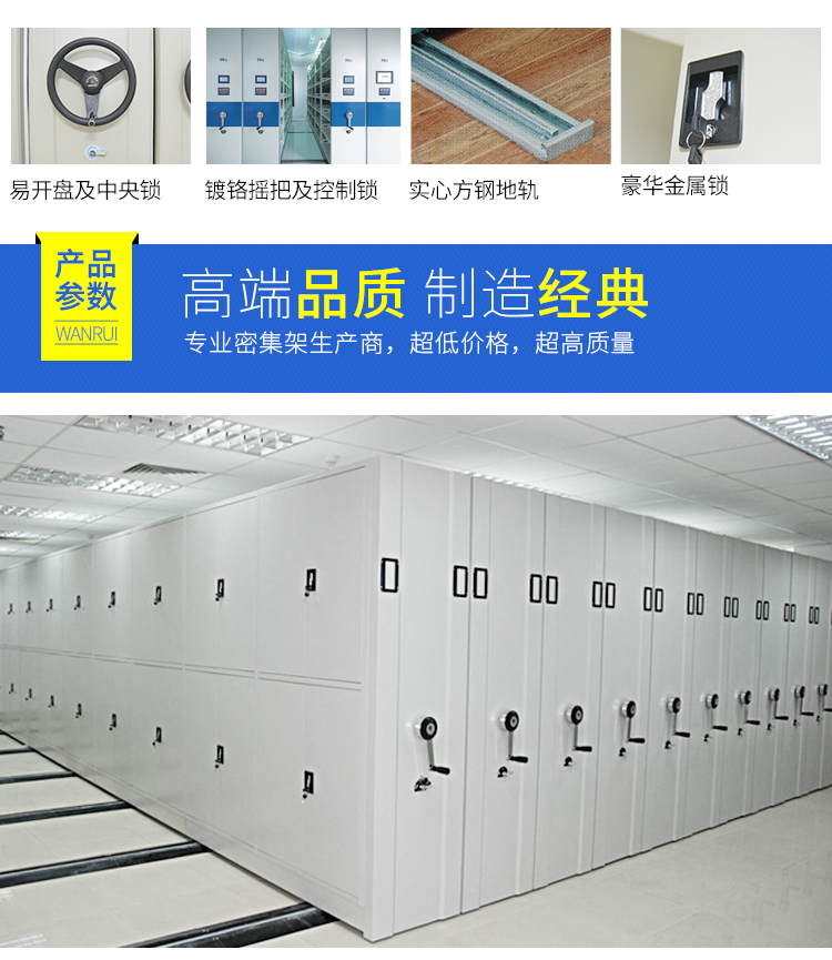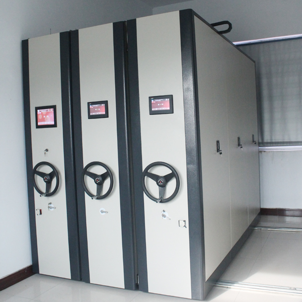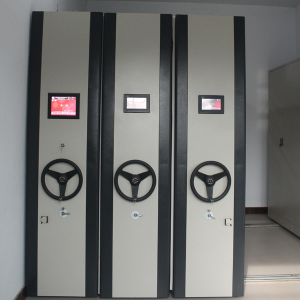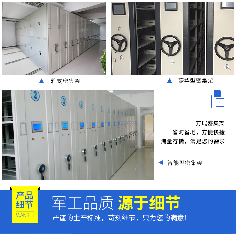 3、万瑞密集架,经测试证明推动力与负载力的比例为1:1500,即以1公 斤的力度足以推动1500公斤的承重;