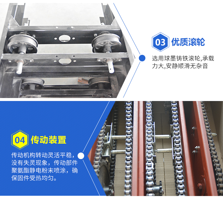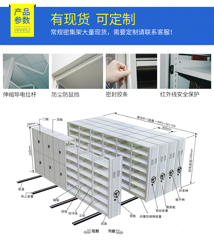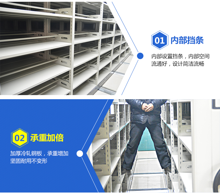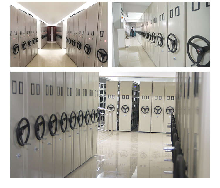 1、科技领先,以优质冷轧钢板精工制造; 2、双轴驱动设计,避免内存物不平衡带来的问题; 3、万瑞密集架,经测试证明推动力与负载力的比例为1:1500,即以1公 斤的力度足以推动1500公斤的承重; 4、喷涂前所有金属配件进行九工位前处理,确保不含油污及表面锈蚀,表面处理为聚氨酯静电粉末喷涂(环保无污染),桥式固化炉确包工件受热均匀; 5、背板的设计,避免了隔板双面互通; 6、挂板的设计,避免储存物件倾倒于邻边,方便整理; 7、球墨铸铁滚轮,承载力大,且安静顺滑; 8、每列加装了隐蔽实用的防倾倒装置和制动装置。